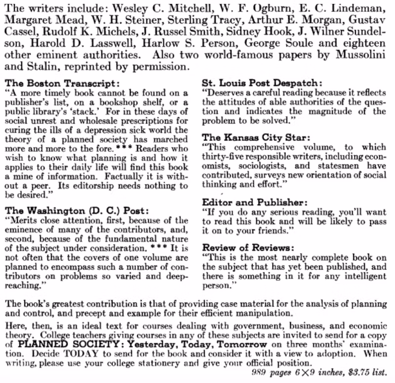 A kitabu kwa jina hilo lilionekana mnamo 1937 kama lilivyochapishwa na Prentice-Hall ya kifahari, na lilijumuisha michango ya wasomi wakuu na washawishi wa hali ya juu. Ilisifiwa sana na maduka yote yenye heshima wakati huo.