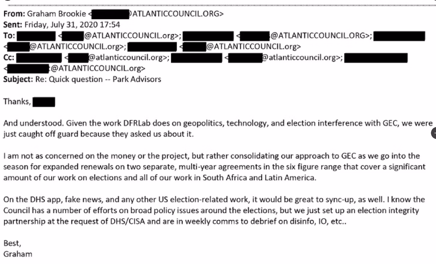 Mwakilishi Jim Jordan kwenye akaunti yake ya Twitter pia ilitoa risiti za jinsi Ushirikiano wa Uadilifu wa Uchaguzi ulivyoanzishwa, kwa kuambatanisha barua kutoka kwa Baraza la Atlantiki ikishauri "kusawazisha" ambapo walianzisha Ushirikiano wa Uadilifu wa Uchaguzi mnamo 2020. Kwa hivyo, ubia wa mashirika manne yanayofanya kazi kwa ushirikiano na zote mbili. Serikali ya Marekani na Baraza la Atlantiki.