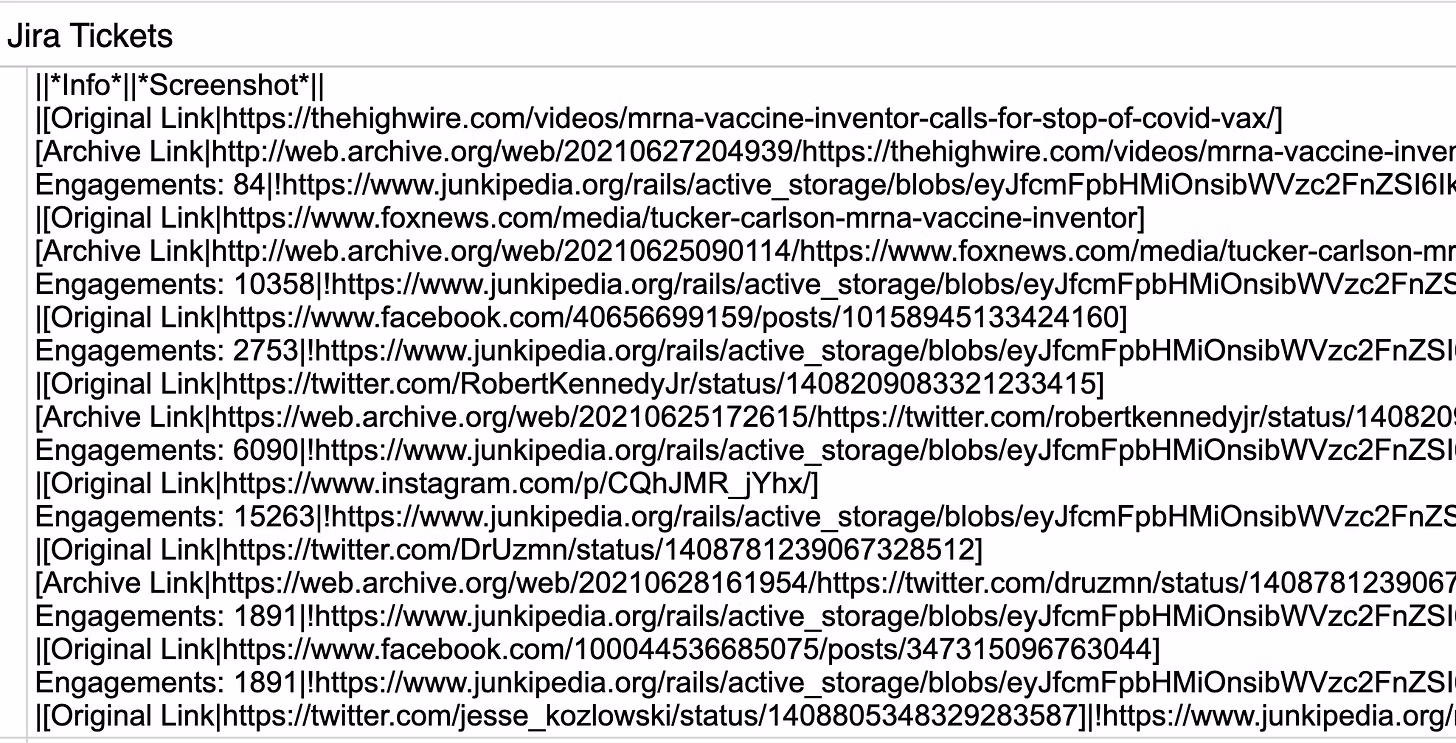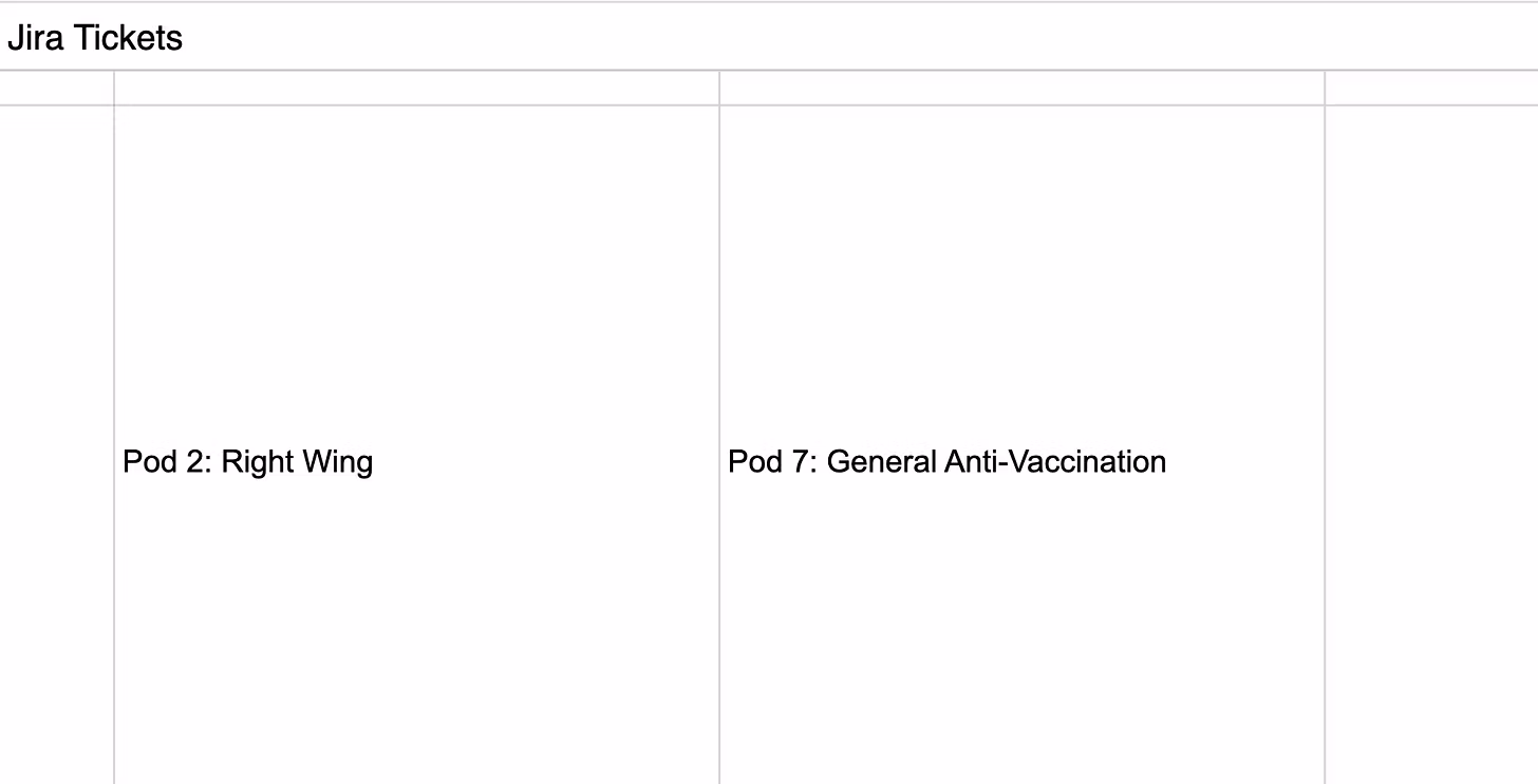 Katika orodha ya Tikiti za Jira, inafaa kuzingatia kwamba tarehe 11 Juni 2021, orodha hiyo ilibadilisha ghafla mwelekeo wake kutoka "habari potofu za uchaguzi" hadi "habari potofu ya chanjo" na ikabadilisha juhudi hizi kuwa mradi wa virusi. Karibu kama kulikuwa na aina fulani ya maagizo kutoka juu .